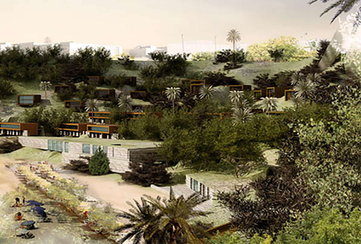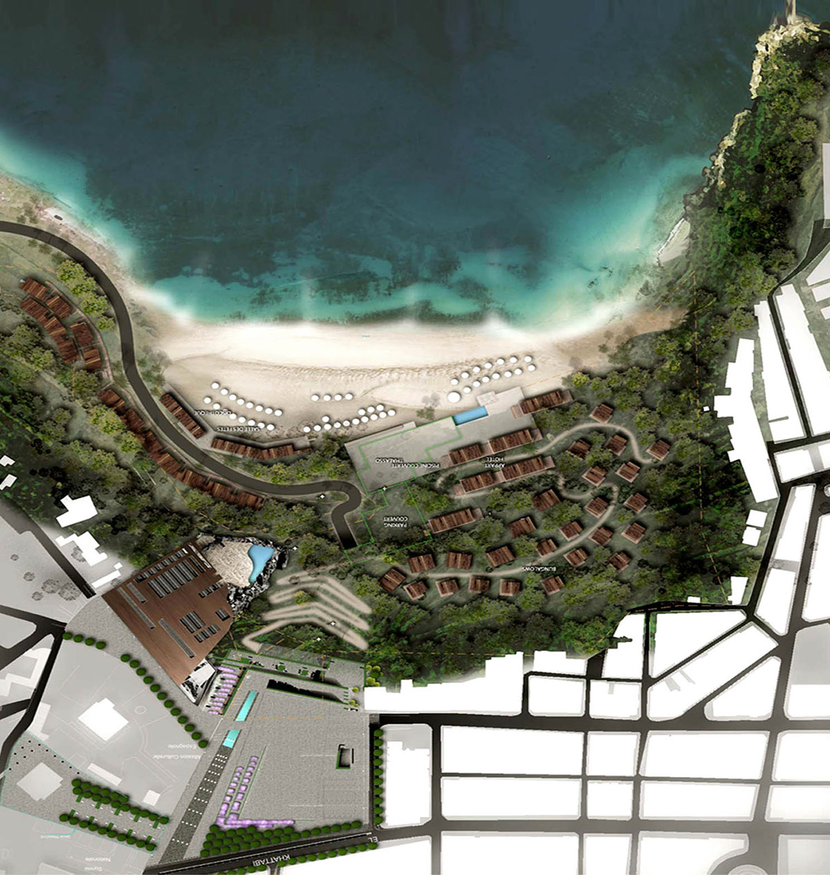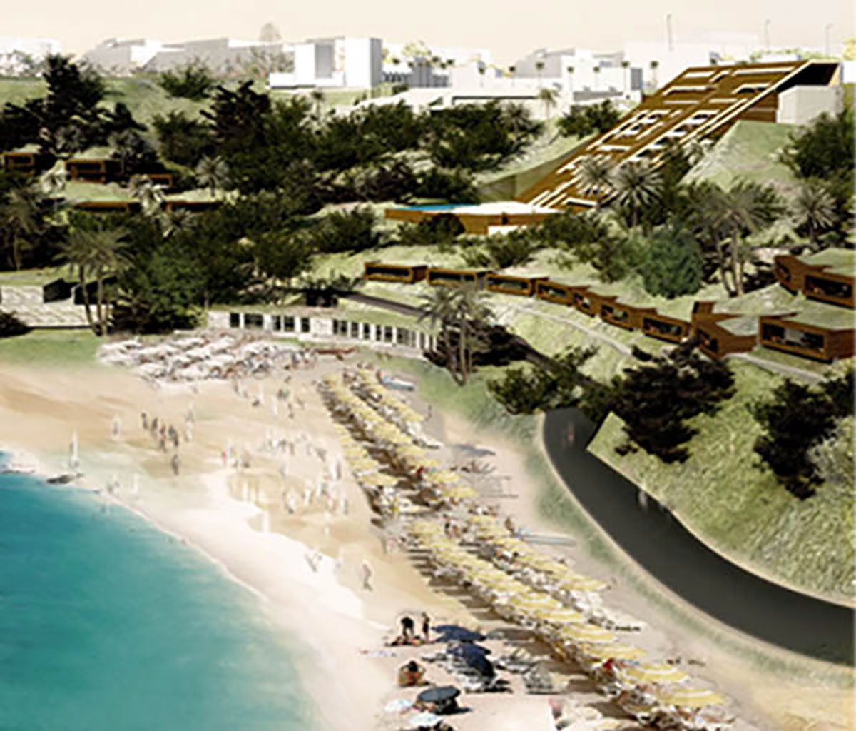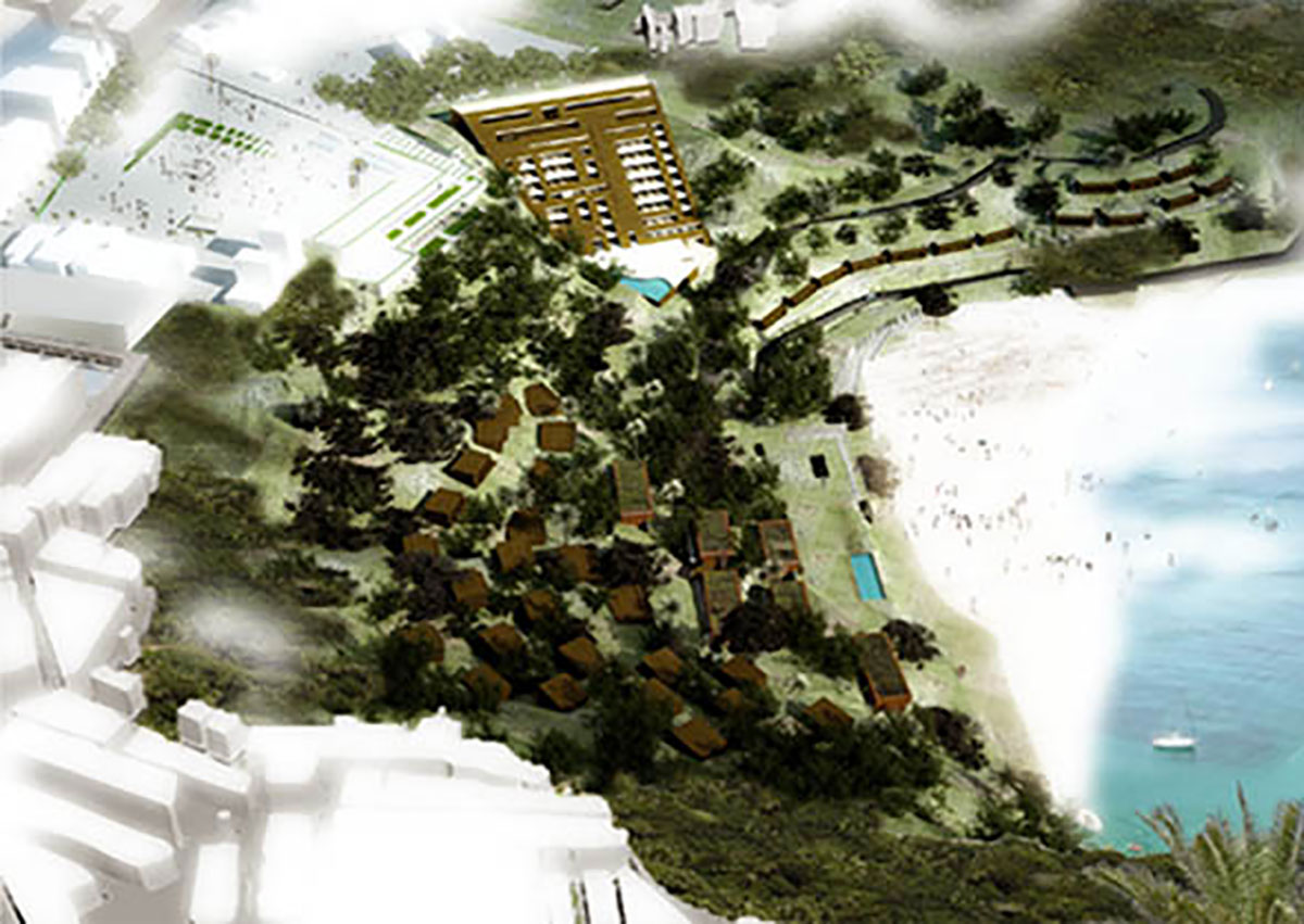 Le complexe hôtelier Quemado resort en est indissociable tant par son histoire, que par sa nouvelle approche. Les anciens bâtiments volontairement détruits libèrent l’espace public et redonnent à la ville, à la place, perspective et vue sur la Méditerranée. La nouvelle architecture, dissociée du tissu existant, est un concept qui minimise l’emprise des constructions dans le paysage. Par son implantation diffuse, elle estompe l’impression de densité engendrée par l’ensemble des éléments du programme. Grâce à des constructions enterrées à divers niveaux, des volumes modérés aux toits le plus souvent végétalisés, l’architecture s’intègre à la configuration du relief. Elle prend en compte des questions environnementales : ventilation naturelle, économie d’énergie et récupération d’eau.