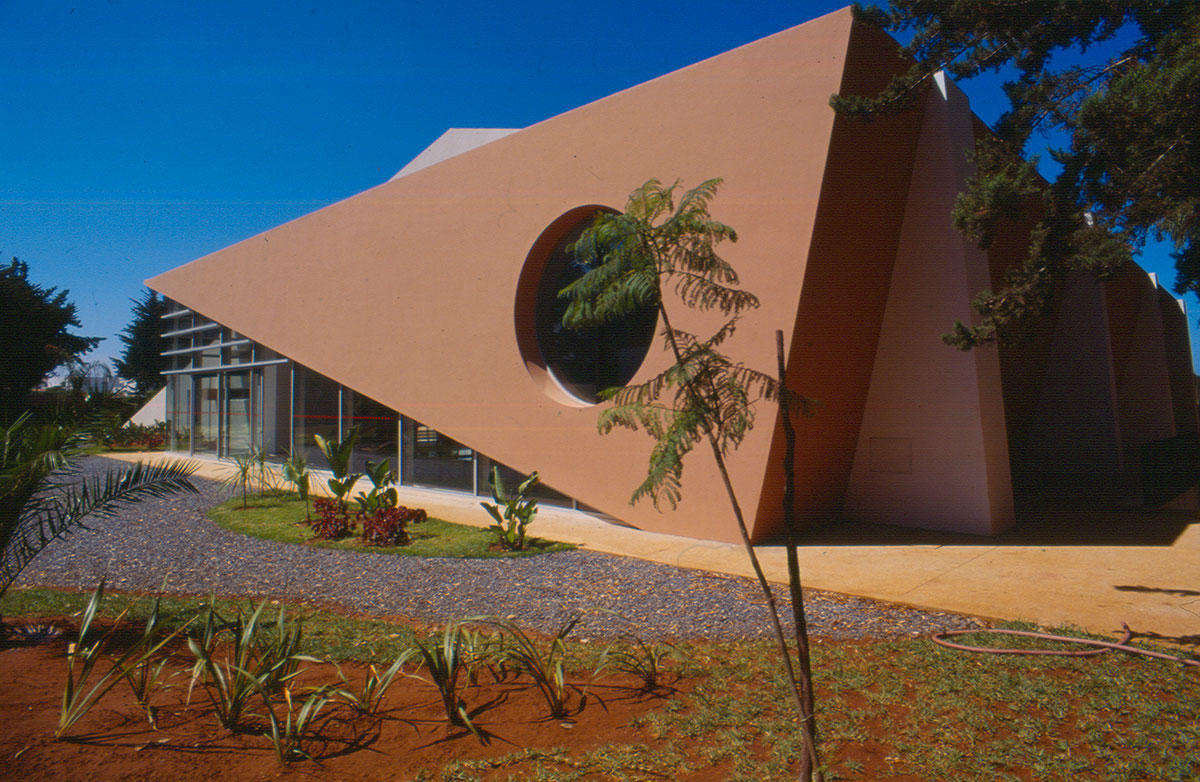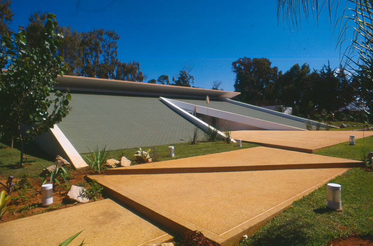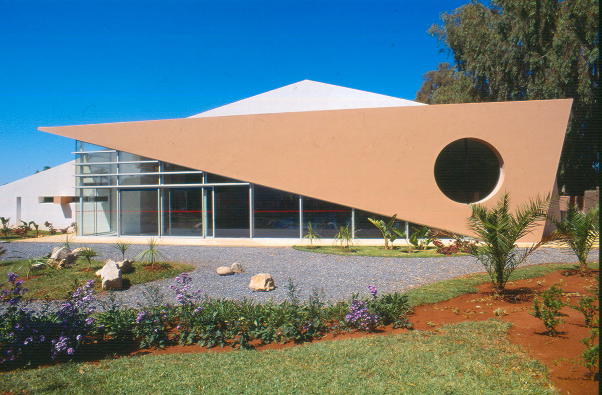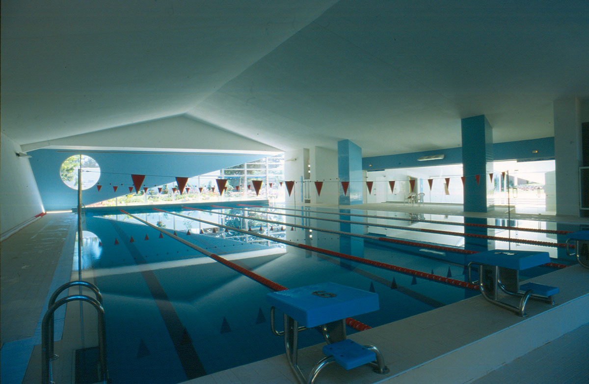 Investissant un angle de parcelle délimité par des courts de tennis et un bassin olympique de plein air, la piscine couverte du vaste centre de loisirs des œuvres sociales du Ministère de la Justice devait s’insinuer tout en douceur dans ce quartier résidentiel de Rabat. Tournant le dos à la clôture et abritant lumineusement l’aire de natation, un parallélépipède de section trapézoïdale rectangle – aux pignons recoupés suivant leur diagonale en deux triangles, l’un en béton enduit ocre rouge et perforé d’un généreux œil de bœuf, l’autre tout vitré – s’y fait précéder par un longiligne tétraèdre abritant astucieusement les vestiaires de part et d’autre du parvis libéré par une très incisive entaille. Initialement conçue engazonnée telle une butée de terre atténuant son impact visuel, cette première couverture en shingles vert mousse assied la composition tandis que l’inclinaison de la seconde facilite sa ventilation naturelle et le ruissellement des eaux de condensation