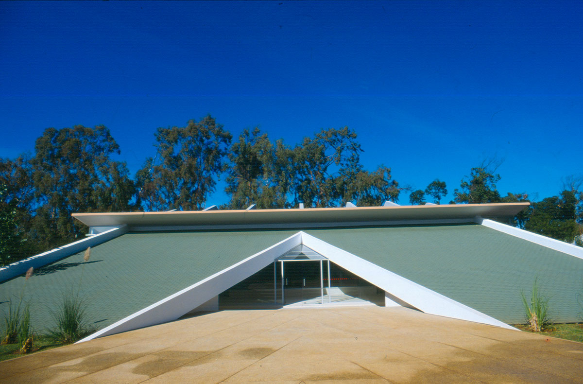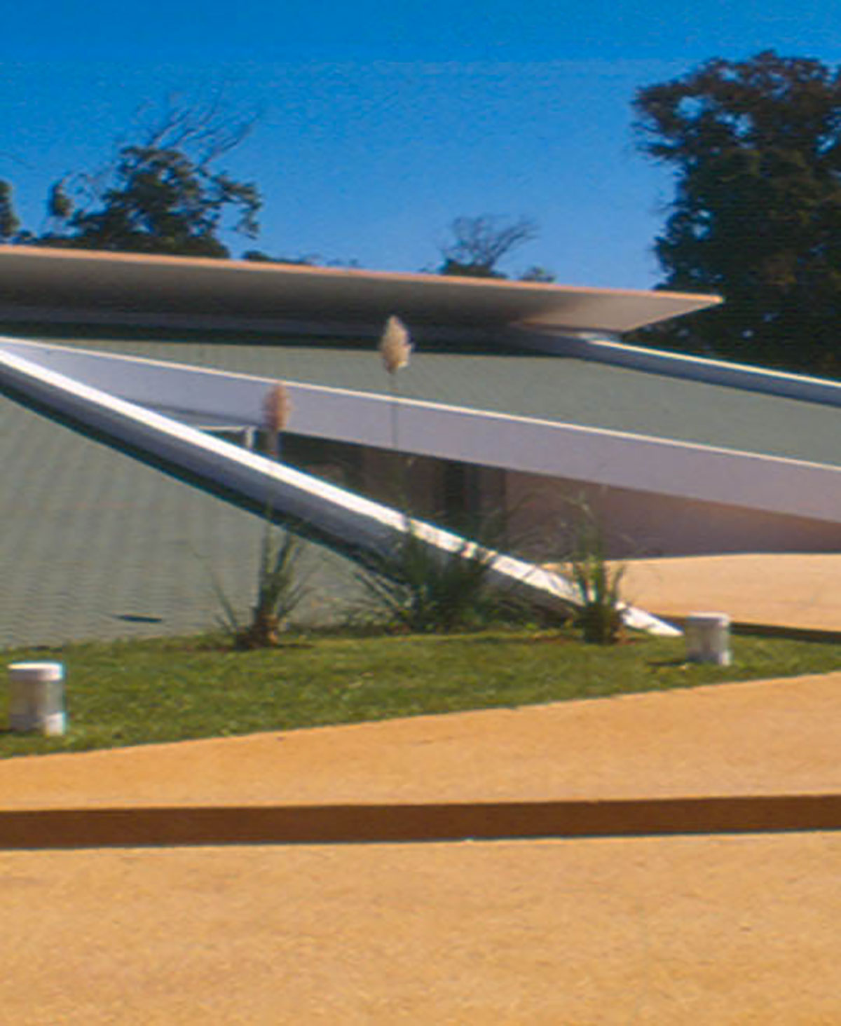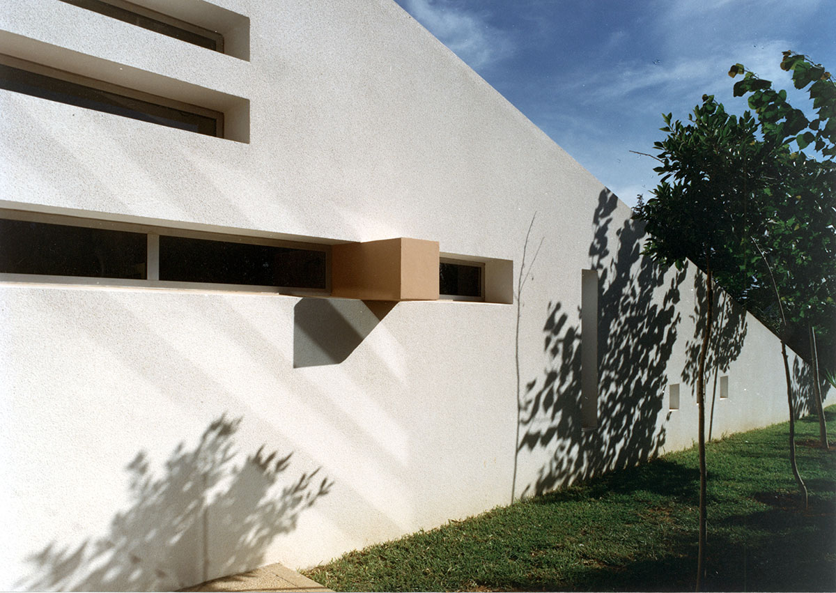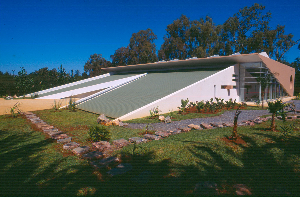 Investissant un angle de parcelle délimité par des courts de tennis et un bassin olympique de plein air, la piscine couverte du vaste centre de loisirs des œuvres sociales du Ministère de la Justice devait s’insinuer tout en douceur dans ce quartier résidentiel de Rabat. Tournant le dos à la clôture et abritant lumineusement l’aire de natation, un parallélépipède de section trapézoïdale rectangle – aux pignons recoupés suivant leur diagonale en deux triangles, l’un en béton enduit ocre rouge et perforé d’un généreux œil de bœuf, l’autre tout vitré – s’y fait précéder par un longiligne tétraèdre abritant astucieusement les vestiaires de part et d’autre du parvis libéré par une très incisive entaille. Initialement conçue engazonnée telle une butée de terre atténuant son impact visuel, cette première couverture en shingles vert mousse assied la composition tandis que l’inclinaison de la seconde facilite sa ventilation naturelle et le ruissellement des eaux de condensation