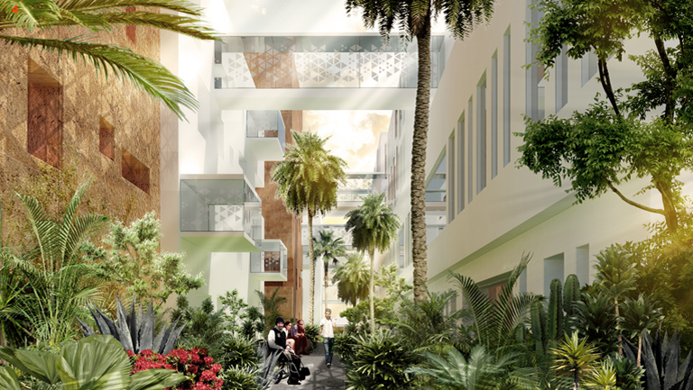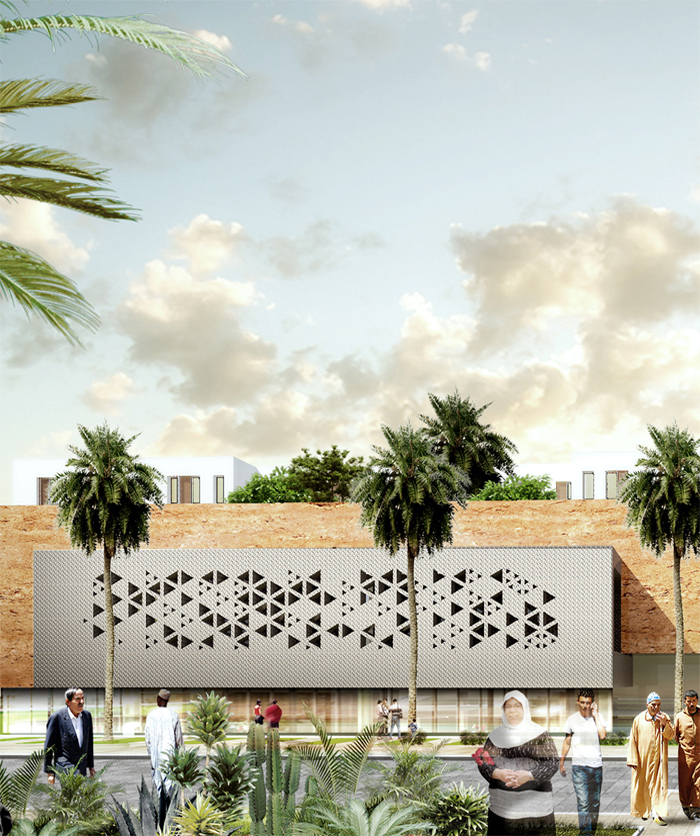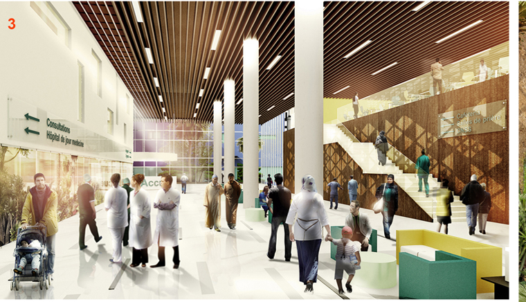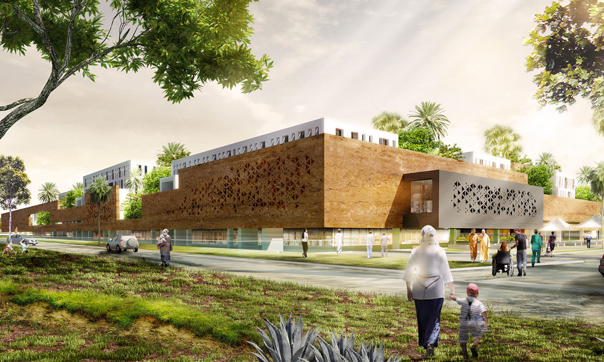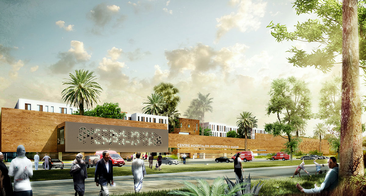 Le projet repose sur le concept d’une « oasis hospitalière », qui profite de la création d’une coulée verte dans le lit de la chabaâ pour y inscrire le long de celle-ci un village hospitalier au milieu d’un écrin de verdure. Une oasis, mue d’une enceinte, couleur terre, qui la protège du soleil et lui procure une fraicheur vitale. L’architecture du futur CHU exemplifie au travers de sa nouvelle image d’une «oasis hospitalière» les valeurs d’excellence, d’humanité et d’intégration partagée par la communauté hospitalière. Elle doit aussi créer un rapport d’échelle respectueux avec l’environnement, et bienveillant et humain à l’égard des patients qu’elle accueille.