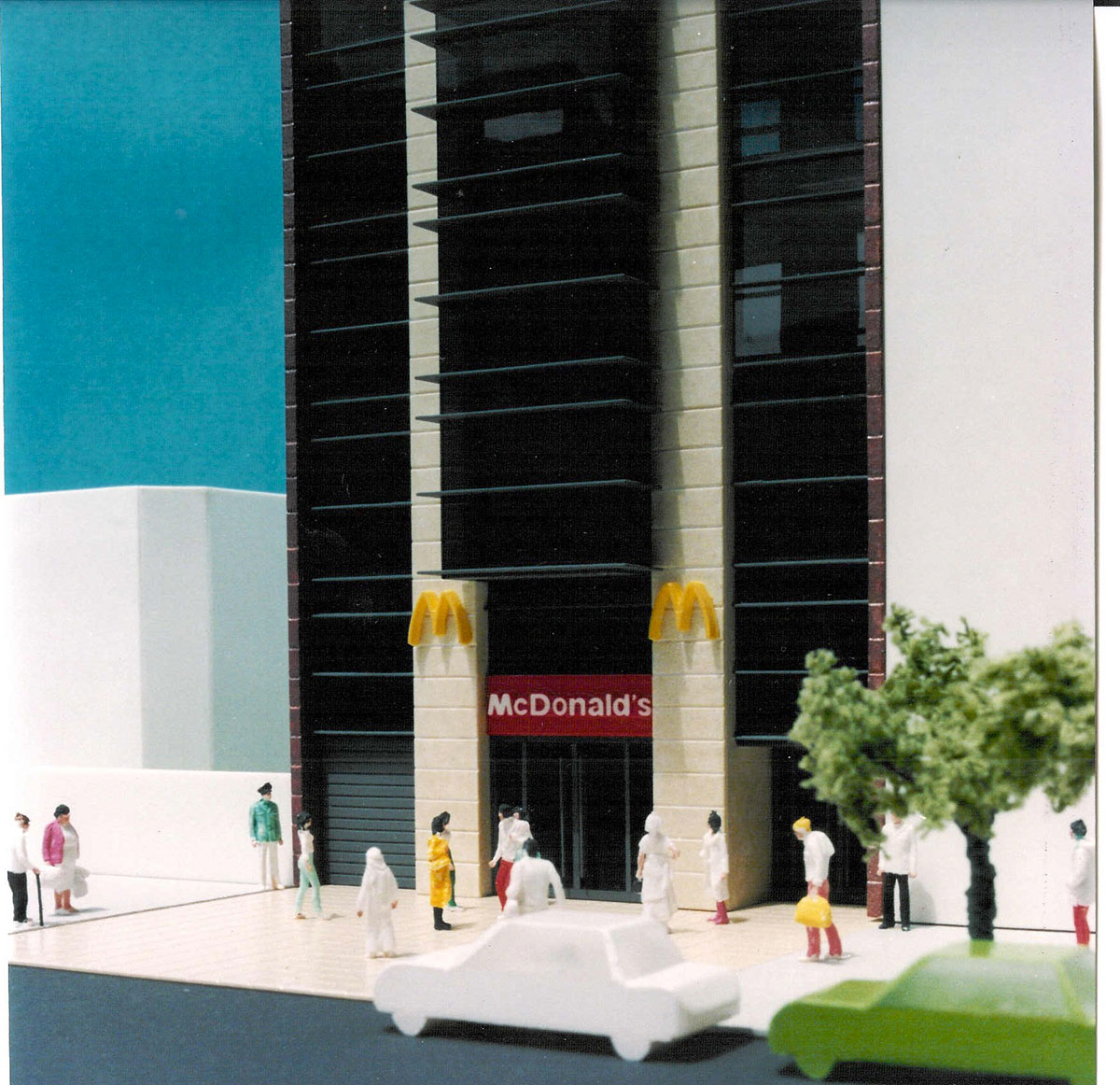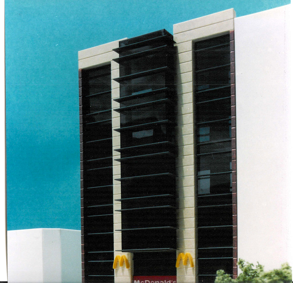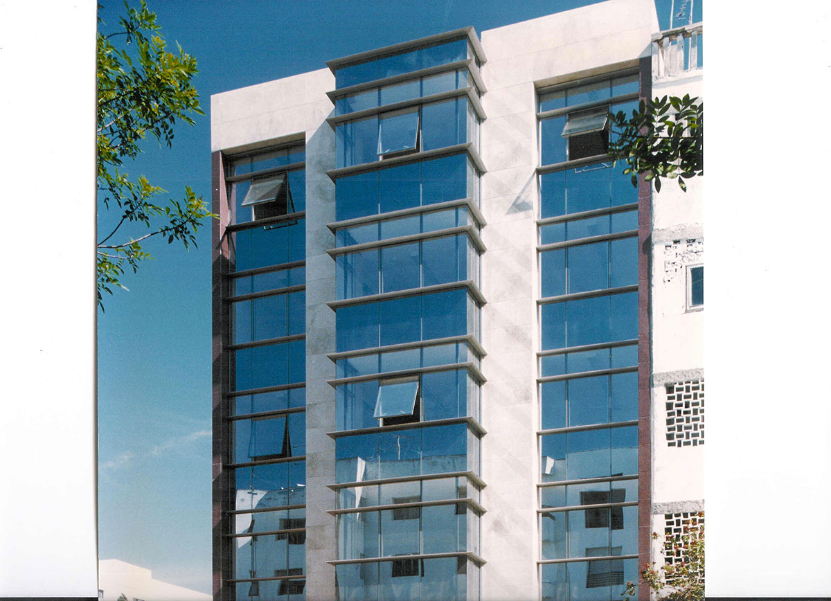 Deux grandes colonnes structurelles ont ici suffi à mettre en valeur le rez de chaussée à usage de restaurant dans cette étroite façade de moins de 11 m, tout en donnant de la grandeur à ce petit immeuble. Les brises soleil horizontaux protègent les bureaux (façade Ouest).