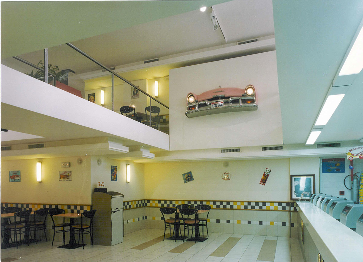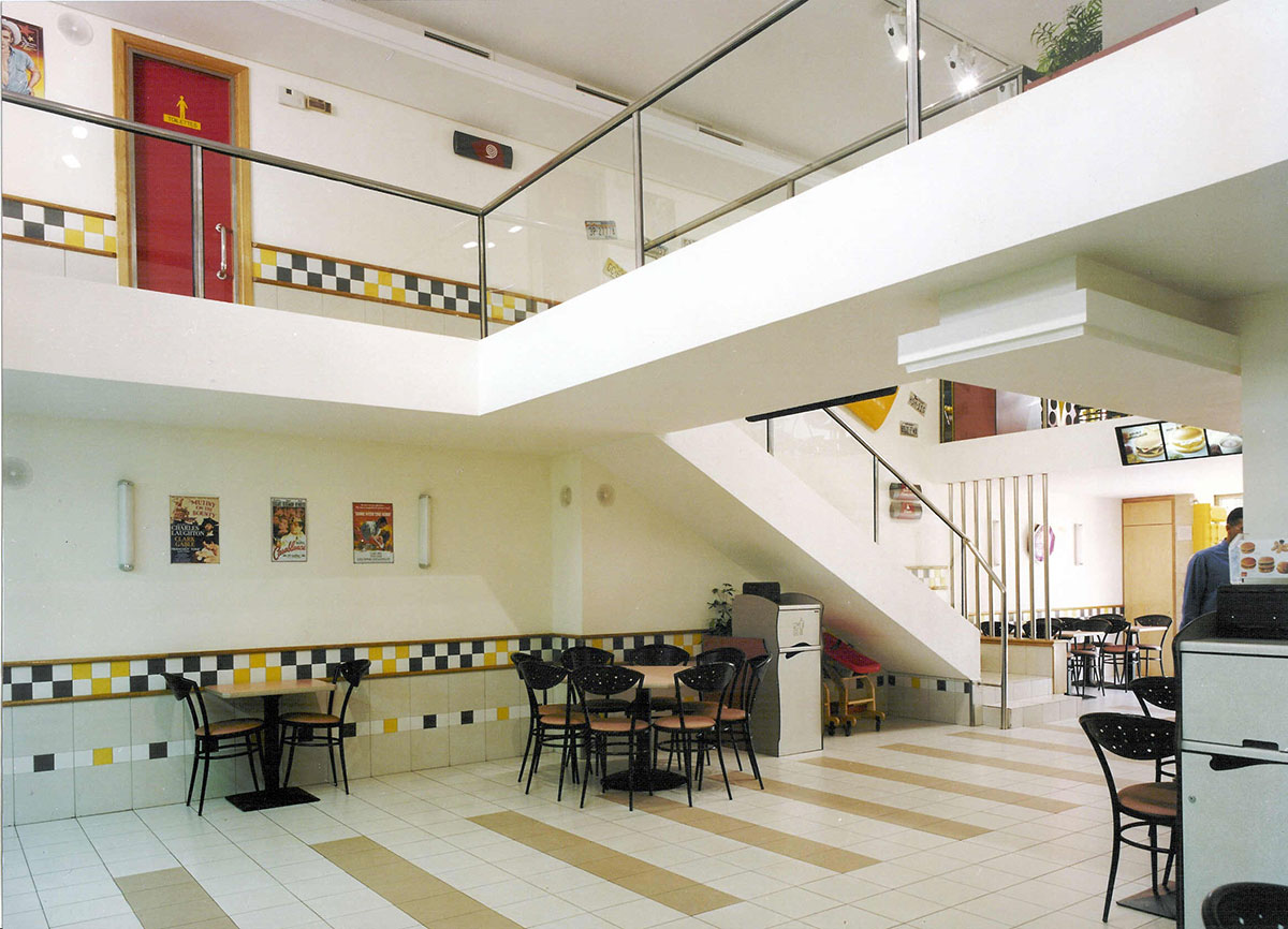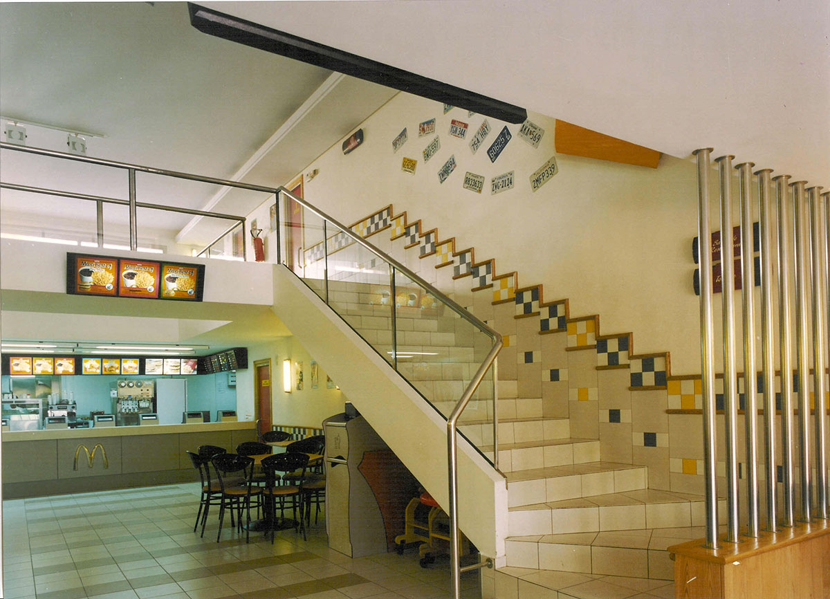 Deux grandes colonnes structurelles ont ici suffi à mettre en valeur le rez de chaussée à usage de restaurant dans cette étroite façade de moins de 11 m, tout en donnant de la grandeur à ce petit immeuble. Les brises soleil horizontaux protègent les bureaux (façade Ouest).