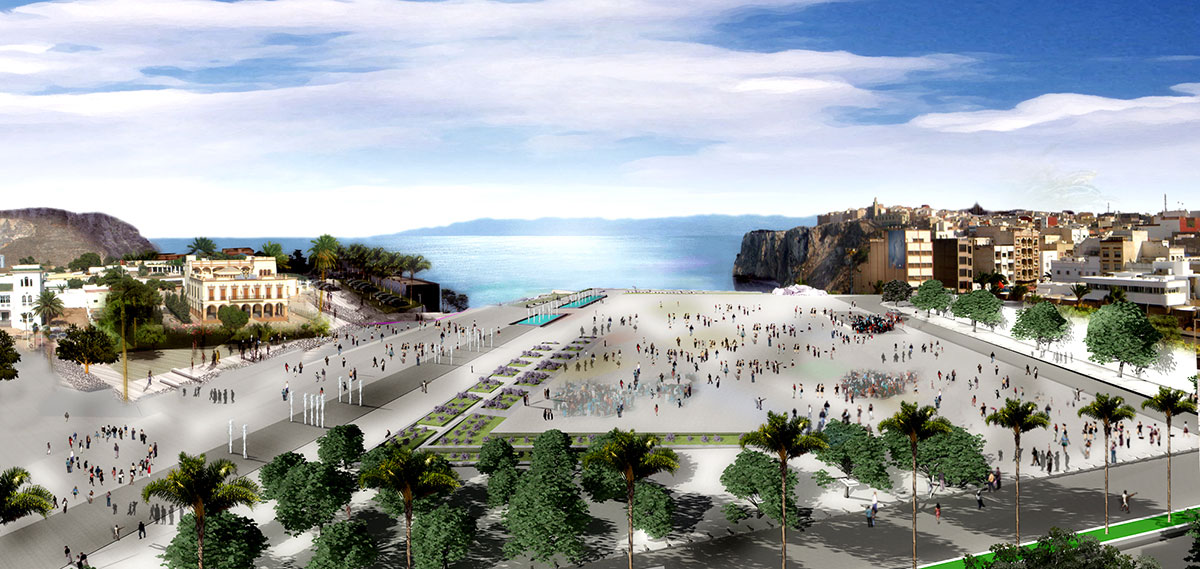 Entièrement dédiée aux piétons, la place Mohammed VI dessinée par Taoufik El Oufir et inaugurée par Sa Majesté le Roi en juillet 2008, s’impose désormais comme une véritable esplanade urbaine de 22.000 m² en belvédère sur la mer. Des terrasses en contrebas équipées de commerces et cafés amorcent la descente vers la plage. Faisant appel à une dizaine de formats, le savant calepin de son dallage unificateur affirme le cône de vision résultant de son plan en trapèze tout en hiérarchisant les usages. Prolongeant l’avenue Tarik Ibnou Ziad, les jets d’eau qui animent l’allée aquatique alimentent un plan d’eau à débordement dont la cascade finale semble se déverser dans la mer. En périphéries Ouest et Sud, un double bosquet de chêne vert tient à l’écart des nuisances des voies de circulation le souk forain s’installant quotidiennement dans cet angle abrité tandis qu’un peu plus à l’Est une généreuse surélévation tient lieu de scène aux manifestations. A la tombée de la nuit, des spots encastrés éclairent arbres et parterres, jets et bassins s’illuminent tandis que des leds incrustés dans le dallage le balisent et que les projecteurs équipant de hauts mats pourvoient en lumière les spectacles.