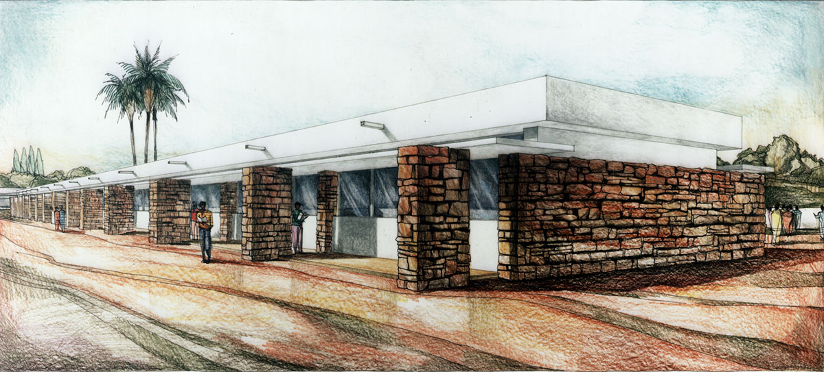 Programme : 6 salles enseignement général, classes, 2salles scientifiques, administration, vestiaire, réfectoire, cuisine, buanderie, dortoir, terrain de sports , logements directeur, 4 studios pour enseignants, logement de concierge, préau.